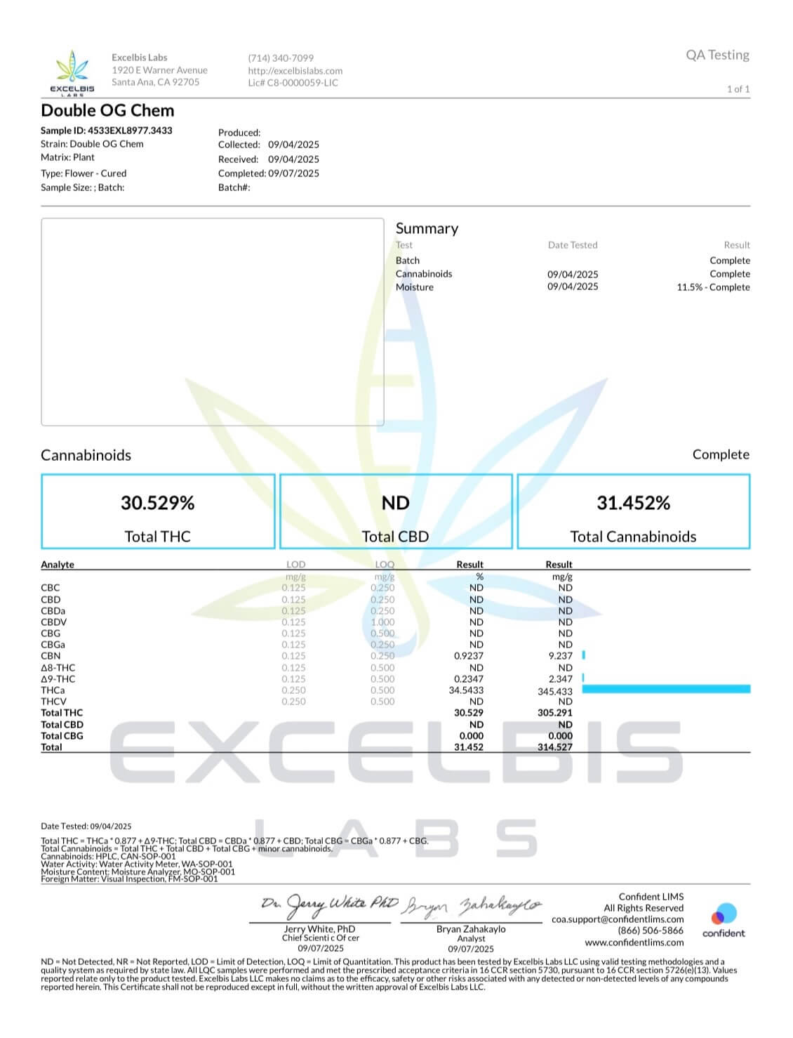 Double OG Chem Dawg is a powerhouse indica-dominant hybrid, delivering old-school diesel flavor with knockout strength. Lab-tested at 30.52% total THC and 31.45% total cannabinoids, this strain is a heavy-hitter for fans of classic Chem and OG genetics.